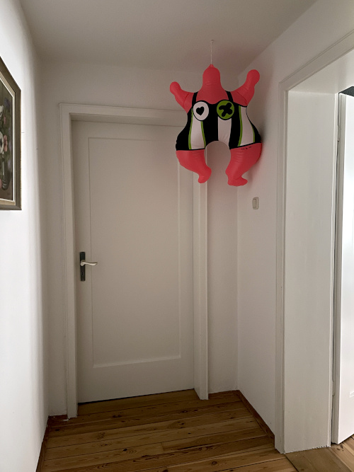 Es gab ihn in drei Ausfertigungen, wenn ich mich richtig erinnere, aber ich wollte auf jeden Fall den pinkfarbenen. Nach dem etwas mühseligen Aufpumpen (aufblasen hat null funktioniert) stand der Ballon zunächst hinter mir, wenn ich am Schreibtisch saß, aber inzwischen hängt er unter der Flurdecke, wo er auf mich herabschaut und mir weiterhin extrem gute Laune macht.