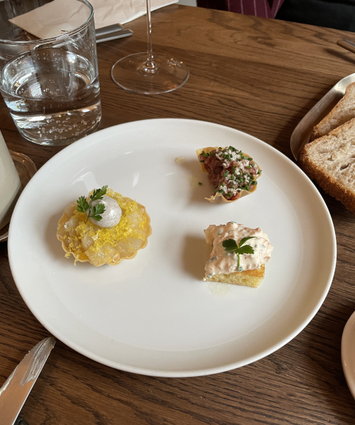 „Bites for bubbles“ steht auf der Karte und das ist es dann auch. Hervorragende Idee, wenn man nur für ein, zwei Gläschen reinschaut oder als Start für mehr. Und weil ich es nicht mehr gewohnt bin zu bloggen und dafür zu fotografieren, waren zwei der Bites schon angeknabbert, bevor ich mich an mein iPhone erinnerte.