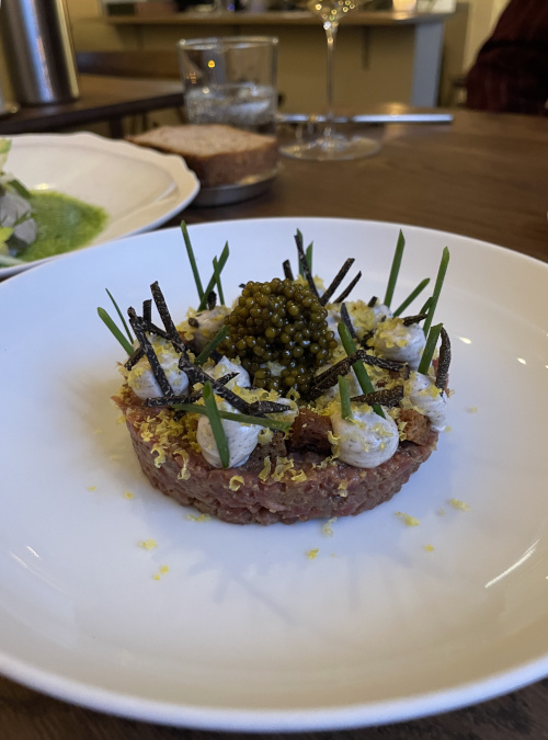 Rindertatar mit Trüffelmayonnaise und gebeiztem Eigelb. Wir nahmen bei beiden Gängen noch einen Hauch Kaviar dazu.