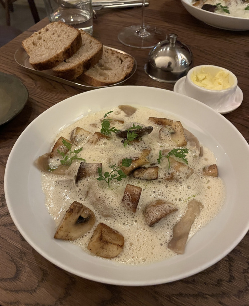 Schlutzkrapfen mit Pilzen, Ricotta und Beurre blanc. Totales Glücklichmacheressen. Im Hintergrund selbstgebackenes Brot, von dem ich auch den ganzen Abend naschte, plus Salzbutter.