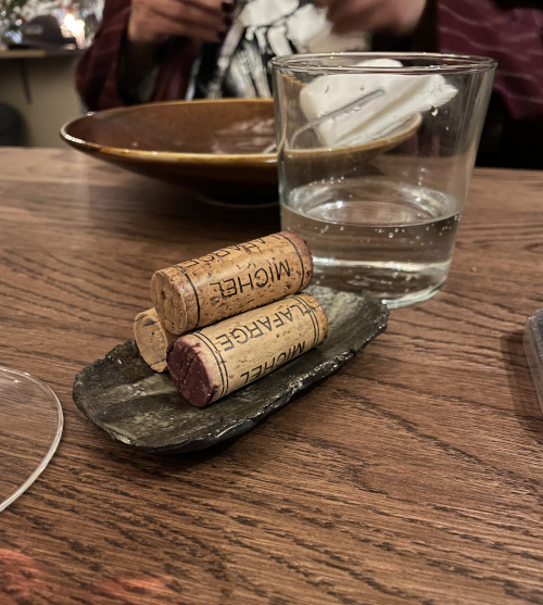 Uns erwartete beim Ankommen eine handgeschriebene Karte mit unseren Namen und ein paar Grüßen vom ganzen Team. Wir begannen mit einem weißen Burgunder von Arnaud Ente, bei dessen Namen ich immer grinsen muss, aber no jokes with names, wissen wir ja. Danach genossen wir zwei Weine von unserem Liebling Michel Lafarge, von dem wir noch keinen einzigen getrunken haben, der belanglos war. Auch deswegen gehen wir gerne in Läden wie das Mokum, das eine kleine, aber äußerst feine Weinkarte hat: Man bekommt dort auch Weine, die für den schnöden Endverbraucher eher schwer zu kriegen sind.
