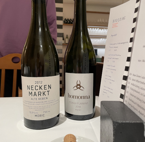 F. und ich feiern unseren Jahrestag traditionsgemäß im schönen Broeding, wo gefühlt jeder Besuch immer ein bisschen besser ist als der letzte. Gestern hatten wir uns im Vorfeld auf Furmint und Blaufränkisch als Weinbegleitung geeinigt und ließen uns dann vor Ort nach einem erneuten Blick in die Weinkarte beraten. Es wurden die beiden Schätzeken im Foto und beide waren großartig.